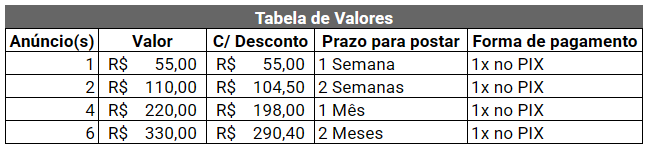 2 - Todas as outras regras do grupo ainda precisarão ser seguidas, o pagamento do anúncio patrocinado influência apenas na liberação da empresa postar a quantidade de anúncios contratada e itens que venham a ser acordados por e-mail, caso o anunciante faça alguma solicitação e esta seja aceita.